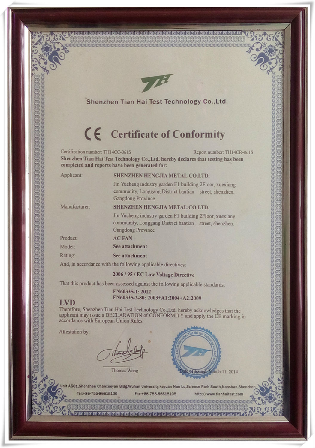 k1体育散热风扇CE认证证书